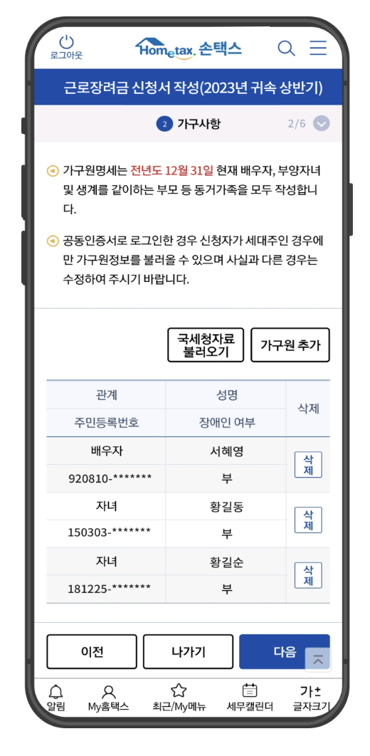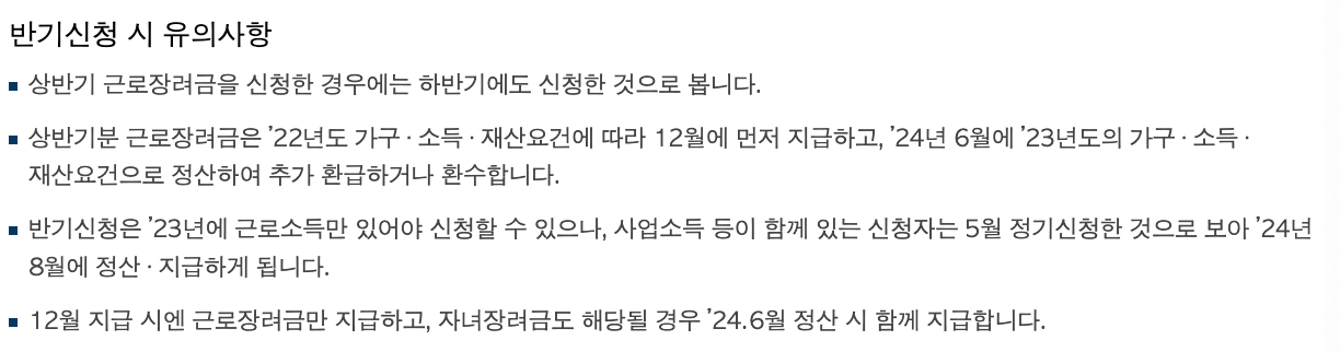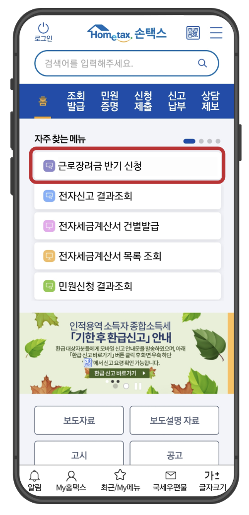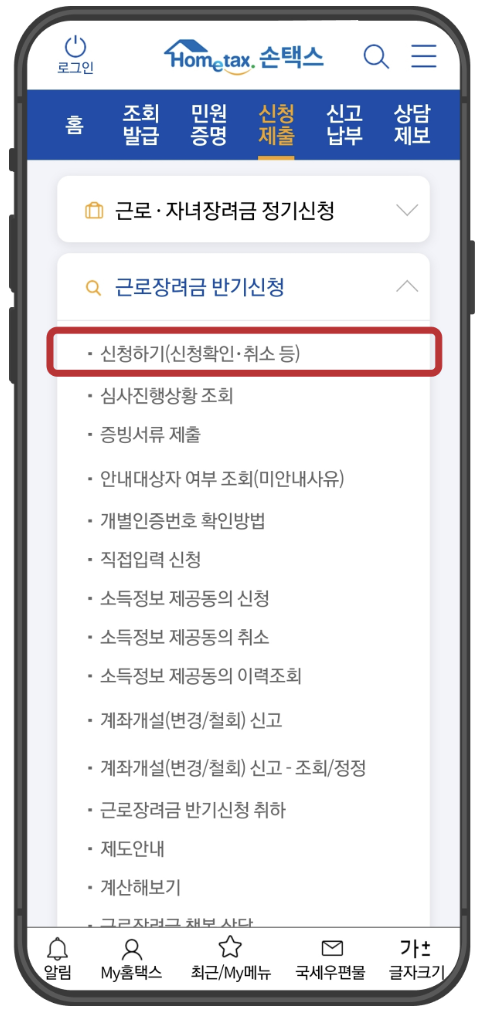 홈택스 접속 → 장려금·연말정산·기부금 → 근로장려금 반기 → 신청하기