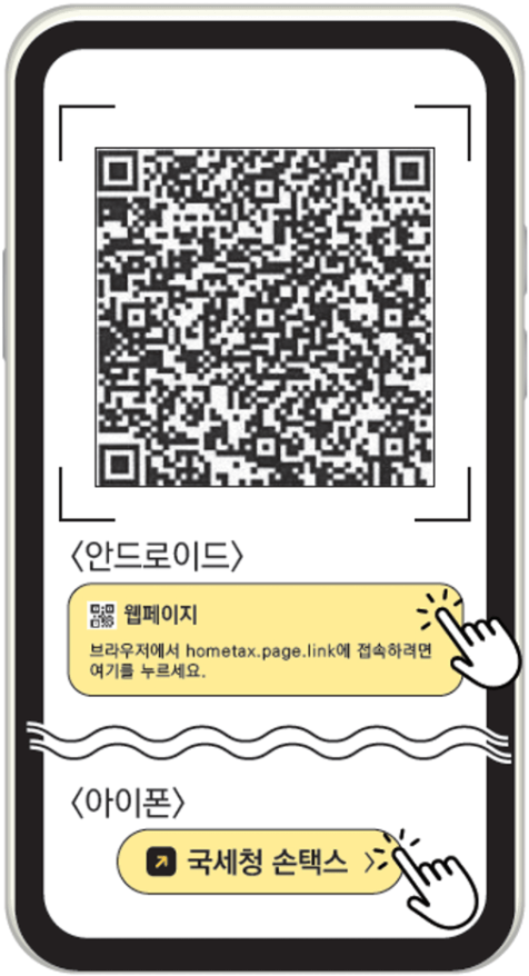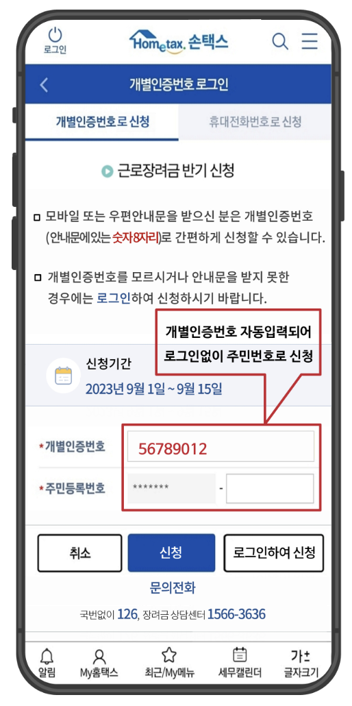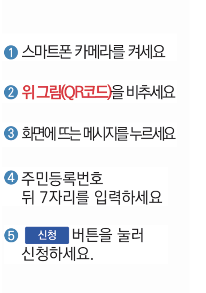 신청안내문에 있는 QR 코드 스캔 → 개별인증번호가 채워진 홈택스 모바일앱 신청화면으로 이동 → 로그인 없이 주민등록번호 7자리 입력 → 신청 버튼 클릭
