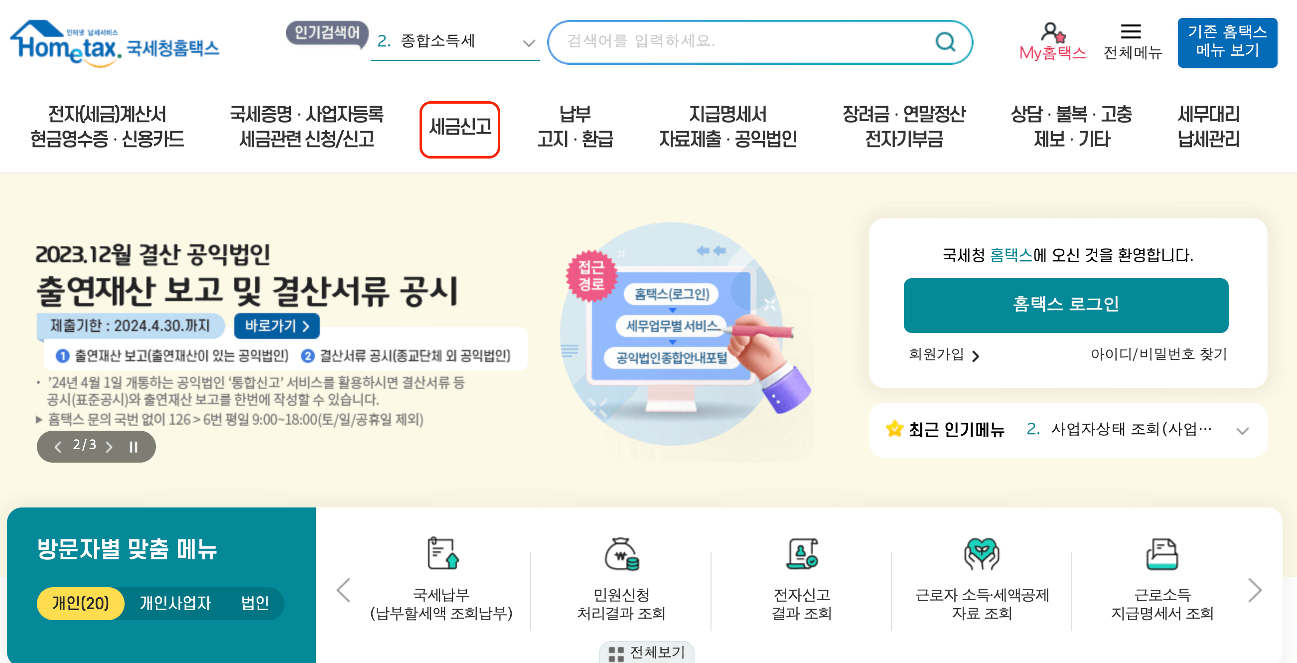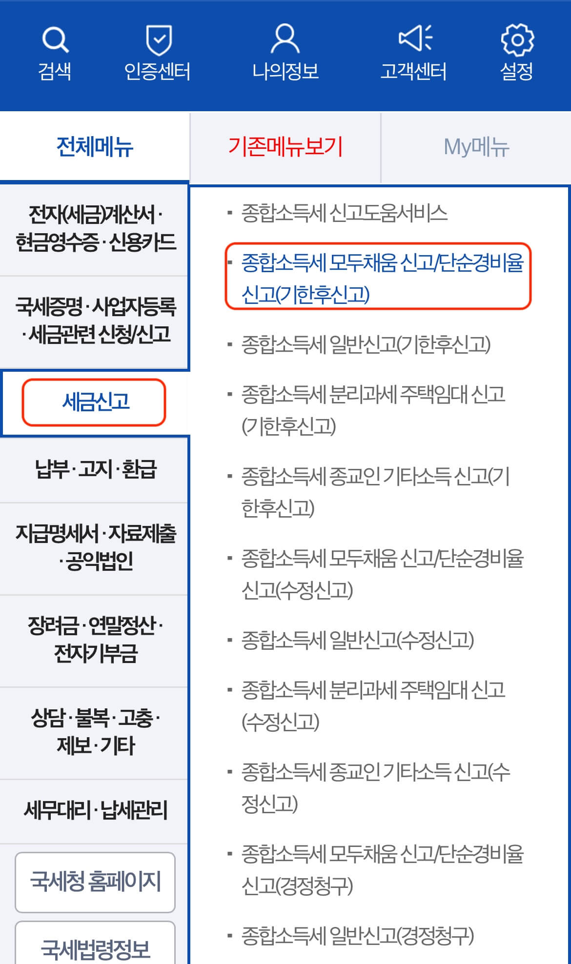 - 인터넷으로 홈택스에 접속해서 [세금 신고] → [종합소득세] → [정기신고]