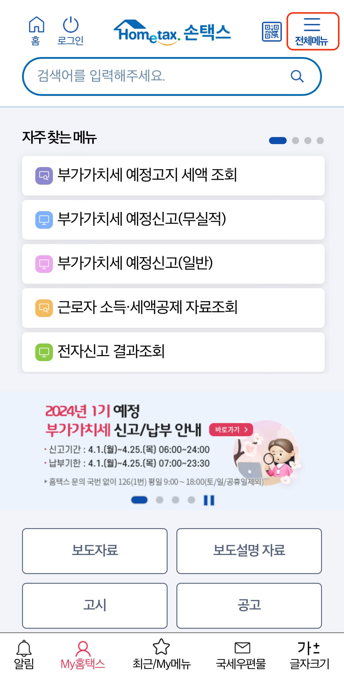 - 모바일 앱 손택스 실행해서 [전체메뉴] →[세금 신고] → [종합소득세 신고] → [종합소득세 모드채움]